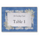Denim texture backgrounds decorated with white-cream lace and some with light bronze jewel designs and ivory pearls to personalise number and name cards for each quest on the table.