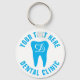 Dental office keychain with coloured tooth logo. Custom round key chain gift idea for dentist practice or dental hygienist clinic. Personalise with your text and monogram. Add company name and more. Double sided. All colours can be changed. Blue example.