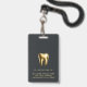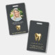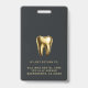 Modern, professional, and elegant dentist office photo ID badge. This design features a single photo, name, title, and business name on the front, complemented by a gold tooth logo on a dark background. Further personalise the back with your address. This ID badge is perfect for dental office employees, offering a sophisticated and cohesive look for your team.