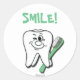 Cute sticker with cartoon tooth holding a green toothbrush on white background.