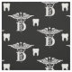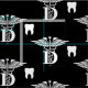 fabric featuring the universal symbol for dentistry and a tooth and a diagonal cross pattern on a black background.