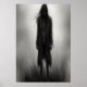 A depressing dark black and white art pf a person standing in the shadow. This is a AI generated art.