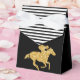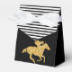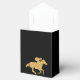 Tent style party favour boxes feature a race horse in faux gold glitter on black and black and white stripes at the top. Change the background colours to anything! Great for Derby party, Derby bridal shower, birthday party, retirement party and more. MATCHING items in our collection.