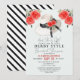 Celebrate the bride-to-be with this chic and modern derby-style bridal shower invitation that features a watercolor illustration of a big hat with roses and a black bow on a light blue background. The reverse side features a pattern of black and white stripes. Personalise it to meet your needs.