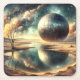 A massive metallic sphere hovers over a reflective, barren landscape, creating an eerie yet mesmerising scene. The sky is filled with vibrant, swirling clouds, casting dramatic reflections in the water below.