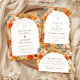 A refined western-inspired design featuring warm desert florals, cacti, and earthy botanicals arranged in a rich, painterly composition. The arched layout adds a timeless architectural feel, balancing the bold surrounding pattern with a clean, elegant center. Terracotta tones, soft neutrals, and muted greens create a grounded yet romantic palette—perfect for a modern desert or western celebration. Ideal for couples who want something unique, artistic, and effortlessly sophisticated.