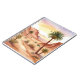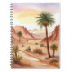 Notebook in an illustration of a serene desert landscape showcasing golden sand dunes and rocky formations under a pastel sky, with lush palm trees scattered throughout. The soft, warm colours evoke a sense of tranquillity and natural beauty.