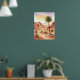 Poster in an illustration of a serene desert landscape showcasing golden sand dunes and rocky formations under a pastel sky, with lush palm trees scattered throughout. The soft, warm colours evoke a sense of tranquillity and natural beauty.