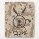 A military brown "subdued" style depiction of a Maccabee's shield and two spears on a desert camo background. The shield is adorned by a lion and text reading "Yisrael" (Israel) in the Paleo-Hebrew alphabet. Hebrew text reading "Maccabee" also appears. The Maccabees were Jewish rebels who freed Judea from the yoke of the Seleucid Empire. Chanukkah is not just a mid-winter festival featuring candles and fried delicacies, it celebrates a military victory, and securing religious freedom, over the Seleucid Empire. Additionally, the revolt was a civil war involving those Jews who were loyal to G-d and those who had adopted the Hellenism of the Seleucids.