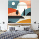 An abstract landscape of a desert scene with lines and shapes in shades of brown, orange, turquoise, beige, tan, and black.