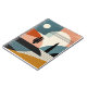 An abstract landscape of a desert scene with lines and shapes in shades of brown, orange, turquoise, beige, tan, and black.