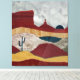 An abstract landscape with unique colours and textures showing a desert scene with a rising blue sun and a cactus in shades of red, grey, beige, and blue.