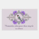 This rectangle sticker has a beautiful close up photograph of a resting hummingbird. It is sitting on wire fence and has its head lifted as if praying or meditating. I have added a pretty ornate vintage frame and clusters of purple flowers. The quote is from The Desidrata and says, "Remember what peace there may be in silence". You can change or remove the quote and change the pale lilac background colour if you like. Matching items are in my "Hummingbird" collection.