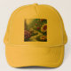 Design a dreamlike scene of a garden with flower trucker hat