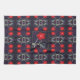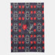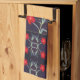 This Kitchen Towel features an original design by ZoeSPEAK, made from an original photograph of a red petunia flower and its slender green leaves. The flower is the framed centerpiece of the pattern, all resting on a dark blue background.