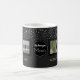 Design your own family photo collage mug for Mum on Mother's Day for her to show off the family- Gift for mum that she will love, or for wife or Grandma to display favourite family pictures. Trendy black and faux silver glitter foil confetti dots background. Reads We love you, Mum in white on a black and white centred circle. Each side displays 2 family photos on black square frames. Each photo has a personalised name below it in white modern letters. Add family pictures of children, grandkids, spouse, pets, or other family members. Personalised gift that will become a keepsake for mama on her birthday or any special occasion.