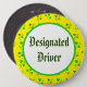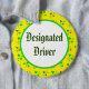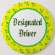 A button reading "Designated Driver" in blackletter, on a pattern of shamrocks on a yellow background.