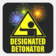 A funny design for the person lighting the pyrotechnics at your Independence Day celebration, this illustration features a yellow caution triangle with a black icon of a person holding a lighter inside. Colourful fireworks explode above the triangle, and yellow text beneath says “Designated Detonator.”
