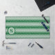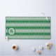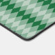 Argyle pattern shows in three shades of green background colour, in alternating rows of dark, medium and light red diamonds. In lower left corner of the mat is a green circle with a darker green outline. Centred in the circle is an initial that may be personalised. Letter will show with a drop shadow.