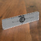 Custom desk name plate comes in any colour, shown in mauve with black lettering and a white initial on a black centre medallion circle. Choose personalise to customise with your personal information, then customise to select colour, etc. Matching desk accessories are available at HAMbyWhiteGlove aka HAMbWG. Design is by HAMbyWG, fulfilment done by Zazzle.
