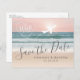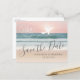 BUDGET Beach destination save the date postcard card with a heart aeroplane over a blush pink sunset on a sand beach with ocean waves and modern type design.