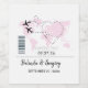 This design features a boarding pass theme. It showcases a pink map of the world along with two aeroplanes making a heart shape as they travel around the world. This destination themed wedding design is set out like a boarding pass with the date of the wedding personalised in the squares. A romantic destination design with an elegant touch. Ideal for a destination wedding no matter where in the world. The perfect all season travel wedding wine label design. Matching wedding invitations and other stationery items are also available.