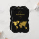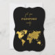 A black and gold destination wedding passport design with gold world map, airplane and travel elements. This design is ideal for all Spring, Summer, Fall and Winter destination weddings. An elegant black and gold wedding travel design with passport layout, world map and custom couple photo. A modern destination wedding invitation design with elegant elements. Matching wedding stationery items and other wedding invite formats are also available.