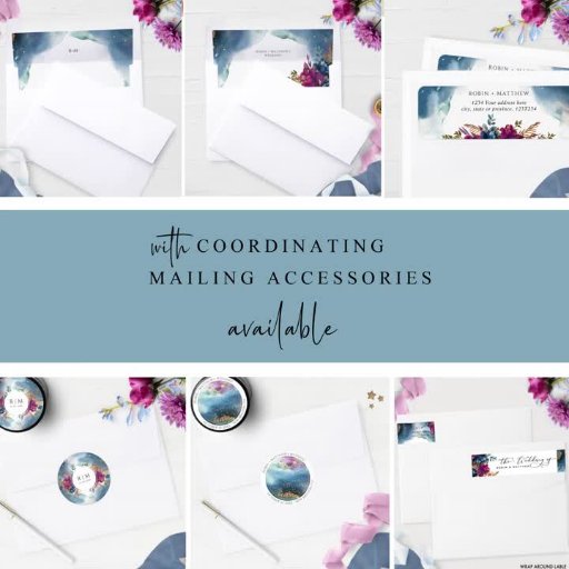 Elegant enclosure card where you can add any details you like, from accommodations, directions, reception details, itinerary.... Card with beautiful watercolor stains on top area in the front, as well as the entire back. "Details" in modern hand written calligraphy. Design with watercolors in an exquisite blend of purple, magenta, fuchsia, teal, turquoise, blue and navy blue hues with elements in gold. Part of our "Mystic Garden" collection with a variety of coordinating products available.