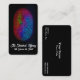 A fingerprint under a blacklight on a black background. This is a business card for private investigators, detective agencies or security professionals