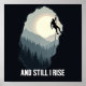 A striking, monochrome digital illustration of a rock climber silhouetted inside a cave opening, rappelling with a rope. The background features a misty, mountainous pine forest with a large glowing moon. Below, the phrase "AND STILL I RISE" is written in bold, white capital letters. The design conveys resilience, determination, and overcoming challenges.