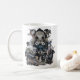 I love this angel artwork and have ordered it on a couple of other products from this creator. I have added my own affirmations to the side. I ordered the larger mug, as it suited my design better. It's a nice shape, taller rather than too wide. It fits my coffee machine if I remove the drip tray. Thank you. The printing quality is excellent. The glare from my camera doesn't do the mug justice. There aren't any marks on the mug, but the glare on the photo makes it look like there is. I have shown this mug next to the smaller mug so you can see how big it is.