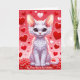 The design presents a heartwarming scene that captures the whimsical charm of a white Devon Rex cat amidst a flutter of red hearts. This front-facing, cheerful feline, with its distinctively soft, curly fur and oversized ears, is the epitome of joy and affection. The Devon Rex's bright, intelligent eyes and impish grin are surrounded by a tapestry of red hearts, symbolising the love and delight that this breed brings into our lives, especially on Valentine's Day.