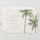 This wedding invitation features a minimalistic and elegant design. The layout is simple, with soft, neutral tones, and the text is delicately arranged. The names are prominently displayed in uppercase, centred in a modern serif font, with a subtle script font used for the "and" between the names. Surrounding the text are illustrations of palm leaves, adding a tropical or botanical touch without overpowering the design. These green leaves are positioned in the top left and bottom right corners, framing the invitation in a way that gives a fresh, airy feel. The overall style is contemporary and clean, perfect for a nature-inspired or destination wedding.