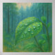 Artwork of a leaf covered in water droplets. Art focusing on a single, vibrant green leaf covered in shimmering raindrops. The delicate textured rendering of each bead of water and the soft misty background of pine trees create a sense of peaceful tranquillity. An ideal piece for bringing a touch of calm nature into a bedroom, bathroom, or any room where you want to unwind and feel connected to the outdoors. The painterly style adds a layer of quiet elegance, making it a perfect accent for a nature-inspired home decor. The impressionistic background of a quiet forest creates a dreamlike quality, while the detail of the leaf brings a sense of intimacy and stillness. A wonderful reminder of the simple, yet profound, moments in nature. This piece can be customised, printed, and or downloaded.