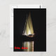 A dhow with its lateen sail lit up moored in West Bay, Doha