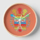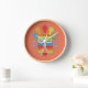 Wall clock in your choice of trim finishes including acrylic and wood, a variety of colours such as black, white, and natural wood. Clock may be ordered as round or square, in several sizes, and hands can be ordered as white or black. NOTE: Artwork is NOT woven but a print of a woven Inca mask.
