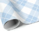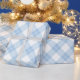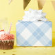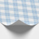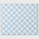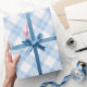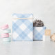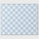 Lovely wrapping paper features baby blue, white, and light blue diamonds in a classic buffalo plaid with thin white lines through the coloured diamonds.