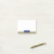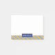 Personalised post-it notes with your name on a blue label atop diagonal stripes in white, mustard yellow, and navy blue.