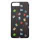 The design on this iPhone 8/7 Plus is an original graphic pattern by HomeWare of old fashioned telephones, the rotary dial styles used before push buttons and cell phones existed. Originally they were always black. But then things became exciting when phones came in colours like light blue, gold, green, white, and red for emergencies! The old phones plugged in with spiral cords that stretched, represented by the red zigzag lines in the pattern being stretched to the max. The background is a black texture with flecks of colour, like the faux marble patterns on the modern material of the 1950s, linoleum. The rotary dials had all the numbers and symbols, but the number 9 in the graphic is the number to dial for an outside line in large companies.