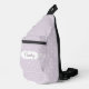 This sling bag features a pale lavender purple scripted name on a pale pink grey Deco style band over a diamond pattern on pale lilac pink with diamond florets at the intersections.