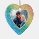 This holiday keepsake ornament features your own photograph within a pretty heart shaped faux diamond frame. The frame is bordered with rainbow colour faux glitter. The other side has the same rainbow border and diamond frame with your custom text on the pale blue interior. An elegant and festive keepsake gift for newlyweds, any couple, or for any portrait photograph. *Please note - the image is printed on the surface, and does not contain actual glitter.