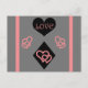 Black and pink heart shapes pattern, along with a diamond (harlequin) shape, decorate this cool, grey postcard! The word "love" shows in the black hearts, written in pink, and there are pink stripes on the sides of the postcard! This would be perfect for Valentine's Day, anniversaries, weddings, or birthdays! Diamond Shapes and Hearts "Love" Pattern © 2019 Regina Blankenship.