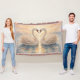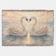 Two swans formed from vintage sheet music drift across diamond-patterned waters beneath a glowing sunset sky of orange, cream, and gold. A quiet moment of balance, light, and reflected melody.