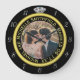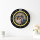 This elegant custom clock has a diamond wedding ring look. The gold band forms a circle with silver clock numbers around the outside, the "12" replaced by the image of a diamond. It all stands out boldly on a black background (see colour variations under "Weddings" in our store). Easily add a photo of the bride and groom to the space in the middle.