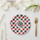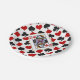 These are cute paper plates for a variety of occasions, but especially card parties. They feature the familiar red, black, and white pattern of diamonds, hearts, spades and clubs commonly found in a deck of playing cards. The centre of each plate has a gold frame around the winking Queen of Hearts.