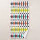 This towel set has a beet washcloth, a turquoise hand towel, and a bath towel with a mid-century modern design of stretched diamonds and starbursts on a field of white.