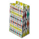 This gift bag has a mid-century modern design of stretched diamonds and starbursts on a field of white.