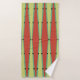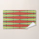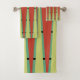 This towel set has a geometric design of light green triangles and rust diamonds formed by green lines.
