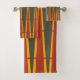 This towel set has a geometric design of green diamonds and rust triangles formed by yellow dashed lines.