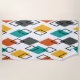 This beach towel has a mid-century modern design of diamonds in orange, yellow, turquoise, gray, and outlined scattered throughout on a field of white.